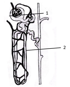 - What is the liquid entering part ‘1’ called? Name two substances present in this liquid that are reabsorbed in the tubule.