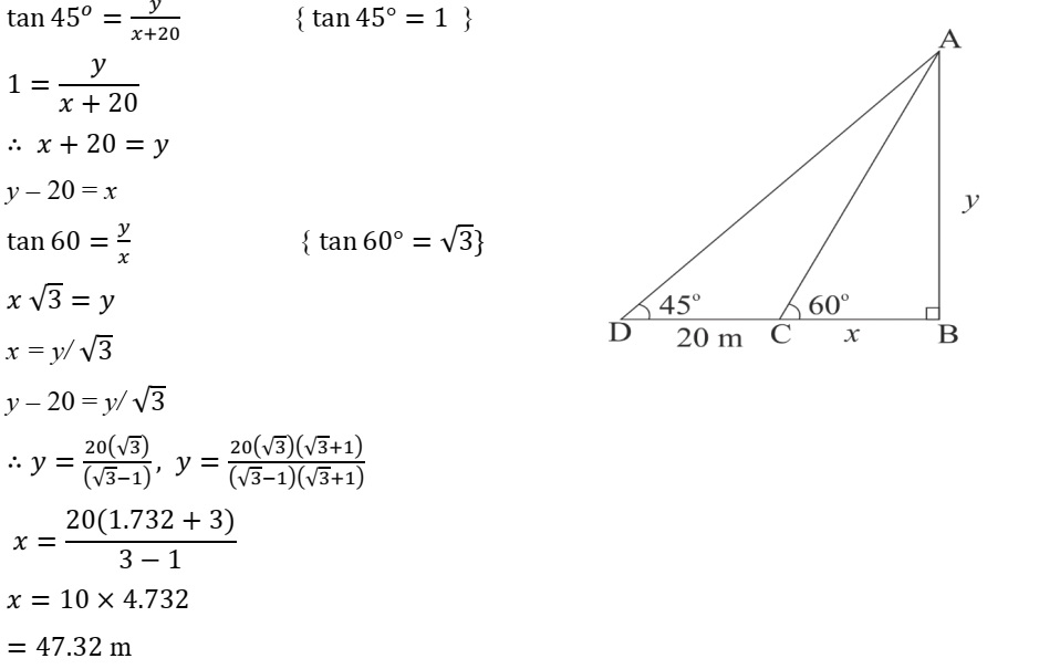 Trigonometry (10)A man observes the angle of elevation of the top of the tower to be 45o. He walks towards it in a horizontal line through its base. On covering 20 m the angle of elevation changes to 60o. Find the height of the tower correct to 2 significant figures.