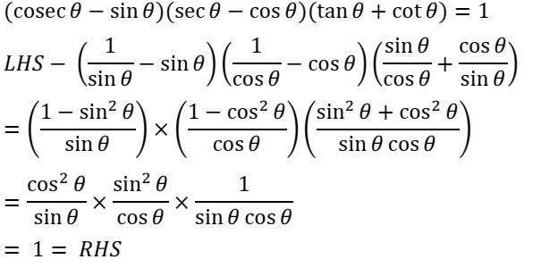 (cosec 𝜃 − sin 𝜃)(sec 𝜃 − cos 𝜃)(tan 𝜃 + cot 𝜃) = 1