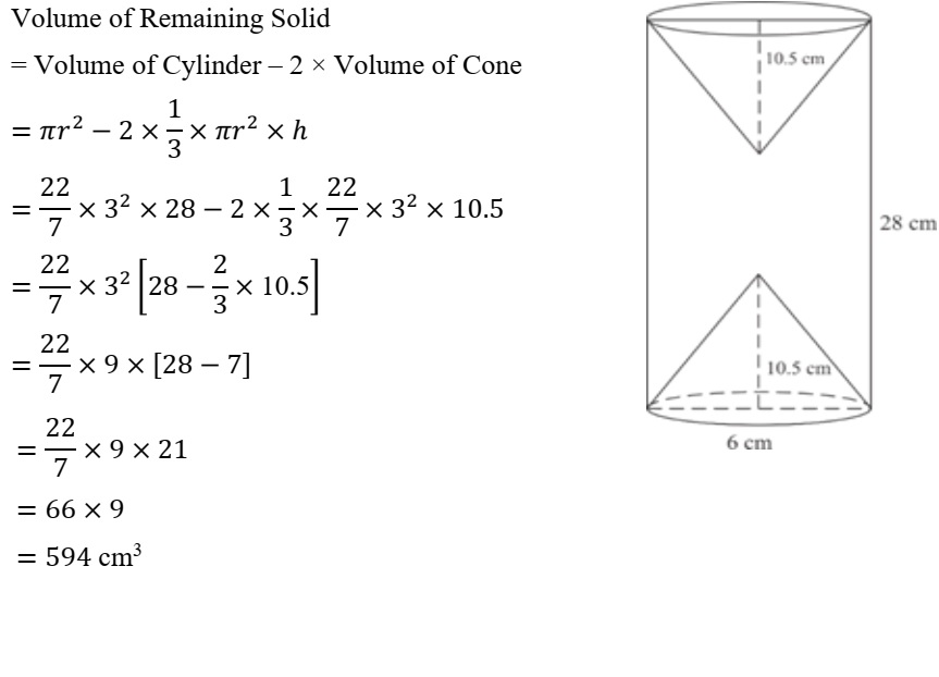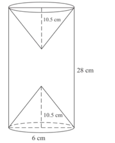 Mensuration (10)From a solid wooden cylinder of height 28 cm and diameter 6 cm, two conical cavities are hollowed out. The diameters of the cones are also of 6 cm and height 10.5 cm. Taking π = 22/7 find the volume of the remaining solid.