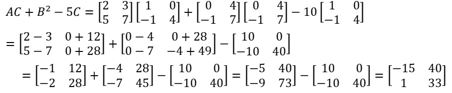Algebra (10)If A = $ \begin{bmatrix} 2 & 3 \\ 5 & 7 \end{bmatrix}, B = \begin{bmatrix} 0 & 4\\ -1 & 7 \end{bmatrix}, C =\begin{bmatrix} 1 & 0 \\ -1 & 4 \end{bmatrix}$, find AC + B2 – 10C.