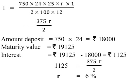 Commercial Mathematics (10)Mr. Sonu has a recurring deposit account and deposits ₹ 750 per month for 2 years. If he gets ₹ 19125 at the time of maturity, find the rate of interest.