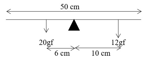 Force, Work, Power, Energy (10)A half metre rod is pivoted at the centre with two weights of 20 gf and 12 gf suspended at a perpendicular distance of 6 cm and 10 cm from the pivot respectively as shown below.