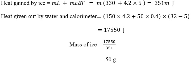 Heat (10)Calculate the mass of ice needed to cool 150 g of water contained in a calorimeter of mass 50 g at 32ºC such that the final temperature is 5ºC.