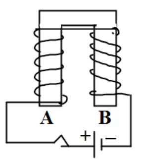 The diagram shows a coil wound around a U shape soft iron bar AB